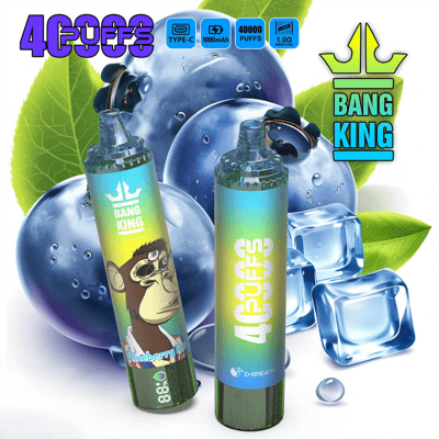 The Blueberry Ice flavor of the Bang King 40K Disposable Vape offers a refreshing blend of sweet, juicy blueberries with a cool, crisp menthol finish, providing a smooth and icy vaping experience in every puff.